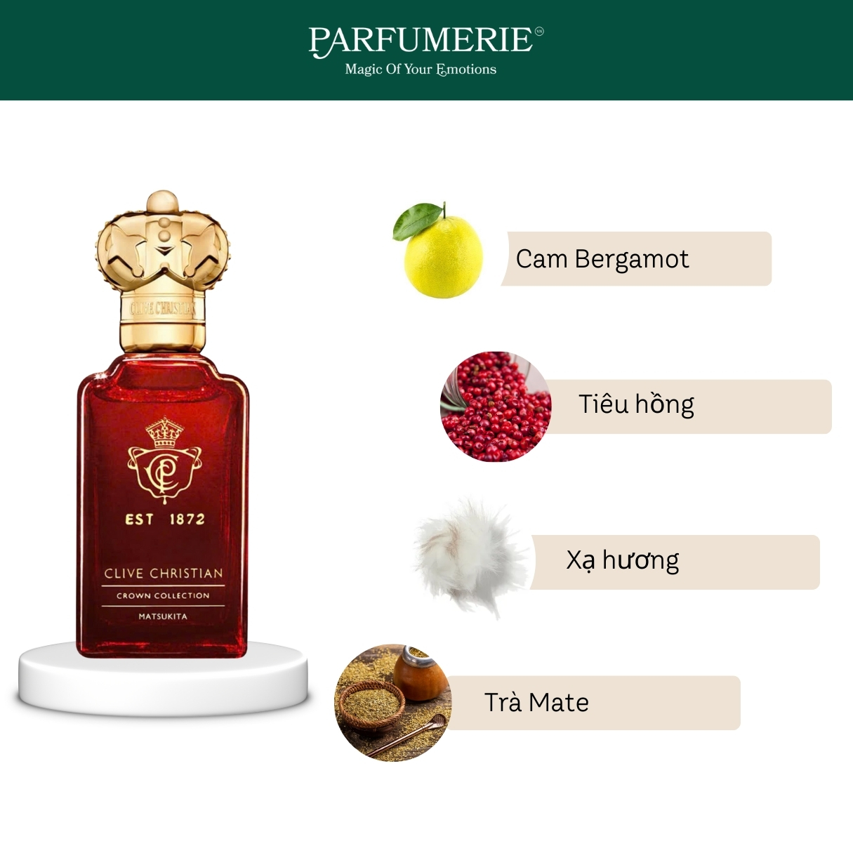 Cái tên “Matsukita” đến từ một sự kiện có thật vào cuối thế kỷ 19: khi một thiếu nữ Nhật Bản mang tên Matsukita được giới thiệu tại triều đình Anh dưới triều đại của Nữ hoàng Victoria. Cô đại diện cho vẻ đẹp phương Đông đầy thanh lịch và bí ẩn - điều khiến cả hoàng gia lẫn giới thượng lưu châu Âu phải xao động. Clive Christian đã lấy cảm hứng từ khoảnh khắc giao thoa văn hóa đó để tái hiện bằng mùi hương vừa lạ, vừa sang, vừa có chút e ấp nhưng lại đầy sức hút.