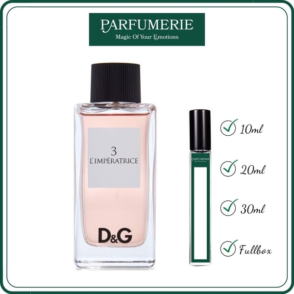Nước hoa nữ Dolce & Gabbana L'Imperatrice 3 EDT chính hãng (D&G Imperatrice 3) nằm trong trong bộ sưu tập D&G Anthology, bao gồm năm loại nước hoa khác nhau. L’Imperatrice trong tiếng Việt nghĩa là “Nữ hoàng”, đại diện cho sức sáng tạo, khát khao và quyến rũ ở nữ giới.
