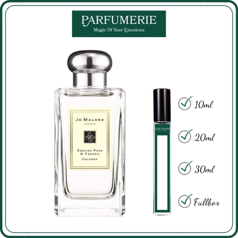 Chai nước hoa Jo Malone English Pear chiết 10ml/ 20ml/ 30ml có dạng xịt phun sương, thiết kế đơn giản bằng thuỷ tinh trong suốt, vỏ chai dày thể hiện sự chắc chắn, nắp chai màu bạc hoặc màu đen làm tăng sự hài hoà và tinh tế của tổng thể chai nước hoa.