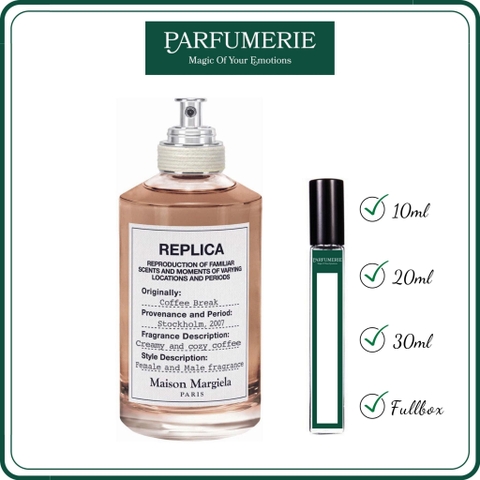 Nước hoa chiết Replica Coffee Break chính hãng từ Parfumerie được chiết từ chai gốc chính hãng vẫn đảm bảo chuẩn mùi và giữ được độ lưu hương như chính nguyên bản. Vì vậy, bạn đừng quá lo lắng việc nên mua nước hoa chiết hay nước hoa nguyên hộp (Fullbox) chai gốc chính hãng nhé, tất cả đều nằm ở sở thích, nhu cầu và ngân sách chi tiêu dành cho nước hoa của bạn mà thôi.